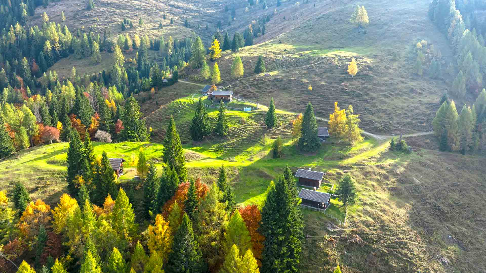Auf der Alm, die bereits geschlossen hatte, sorgte die bereits tief stehende Sonne für eine wunderbare herbstlich bunte Stimmung.
