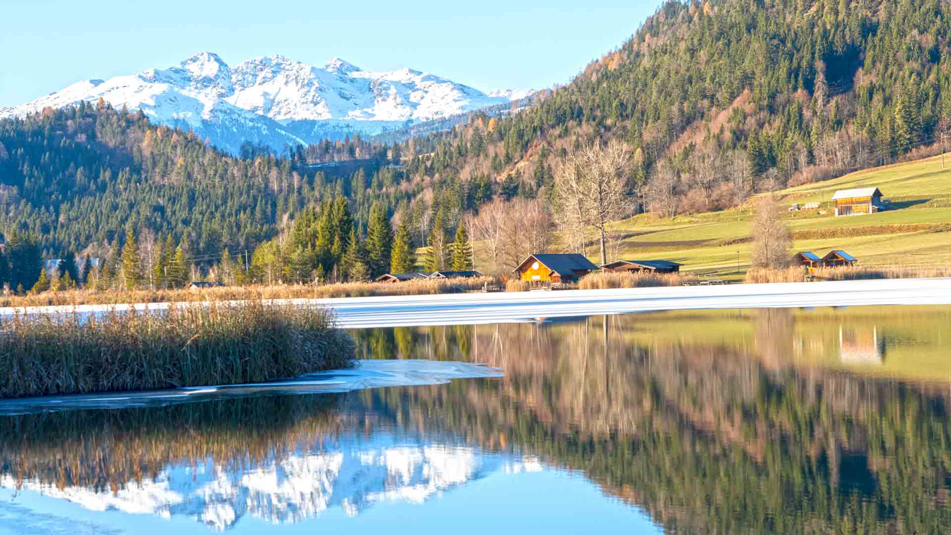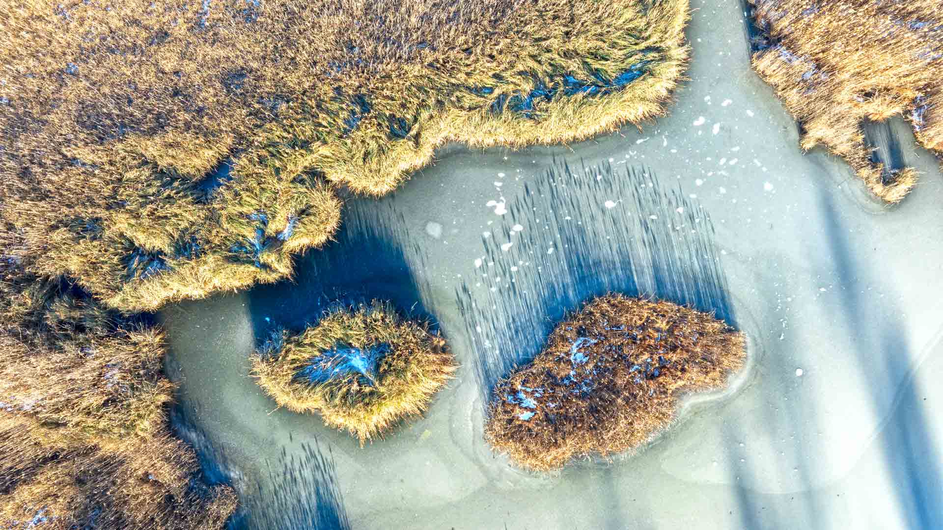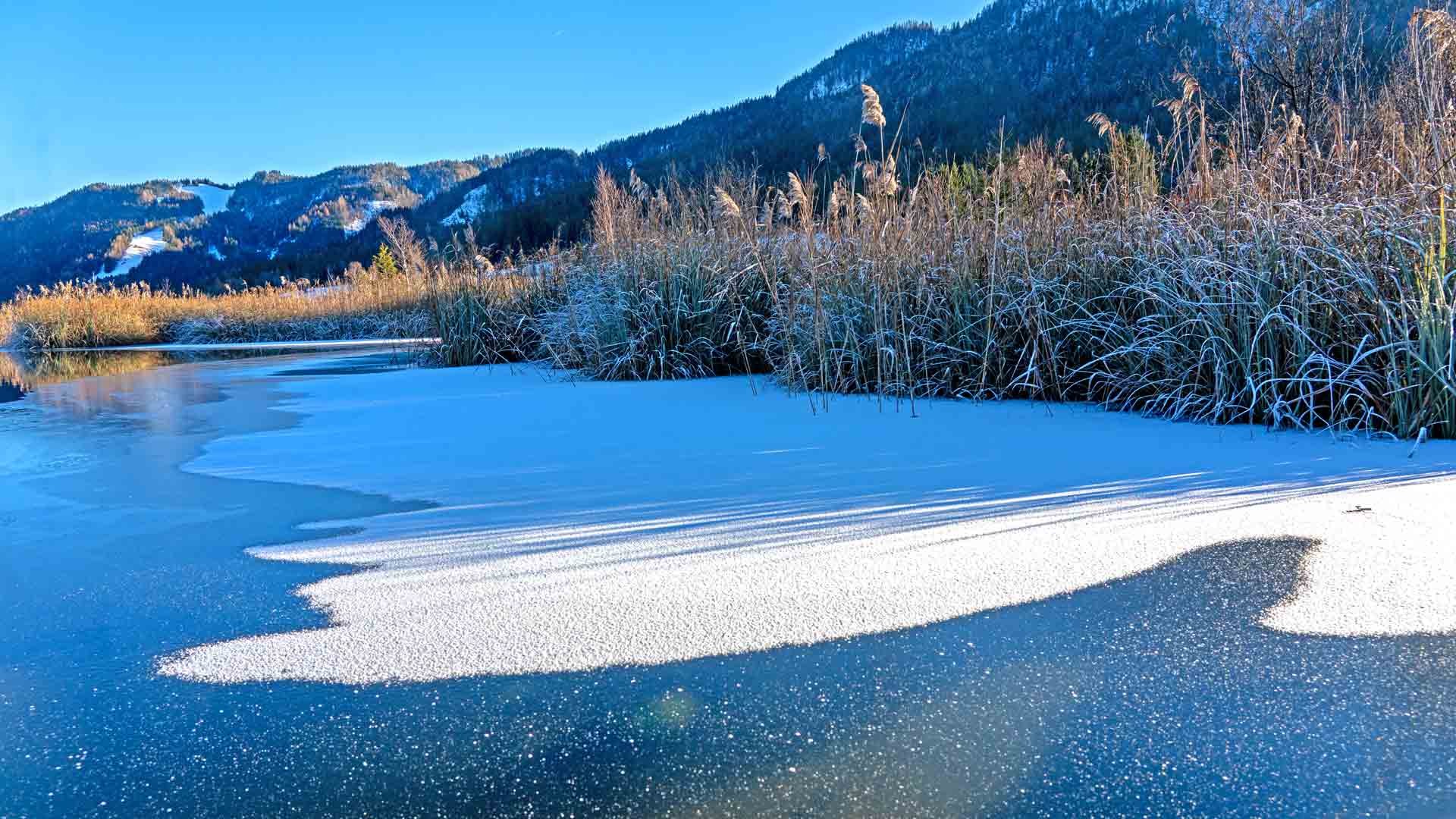 Am schattseitigen Ufer des „großen Meeres“ in Naggl ist, auch im Schilfufer vom Eis noch nichts zu sehen, dort sind noch viele kalte Nächte nötig um dort das Eis wachsen zu lassen.
