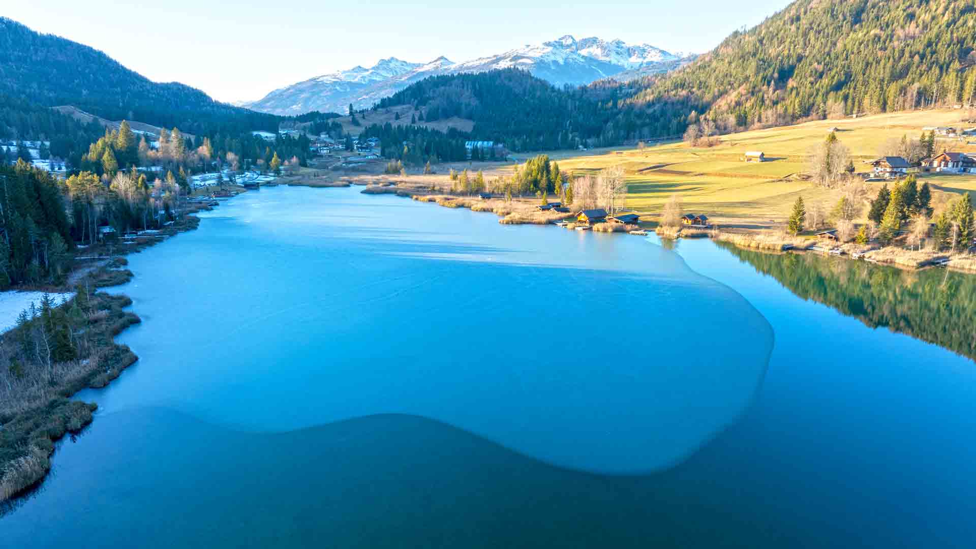 Bei unserer Rückkehr von der Tour zur „Weissen Wand“ am Mittwoch haben wir noch einen Abstecher zum Westufer unternommen. Während das Gatschacher Ufer noch im letzten Sonnenlicht des Tages leuchtete zeigte sich beim Blick auf den See dass das Wachstum des Eises, wegen des für das Eis schlechten Wetters, ins Stocken geraten ist. In der Nacht geht es für das Eis bei Temperaturen von -2°C einen Schritt voran um dann am Tag bei Temperaturen von +6°C zwei Schritt zurück zu weichen.