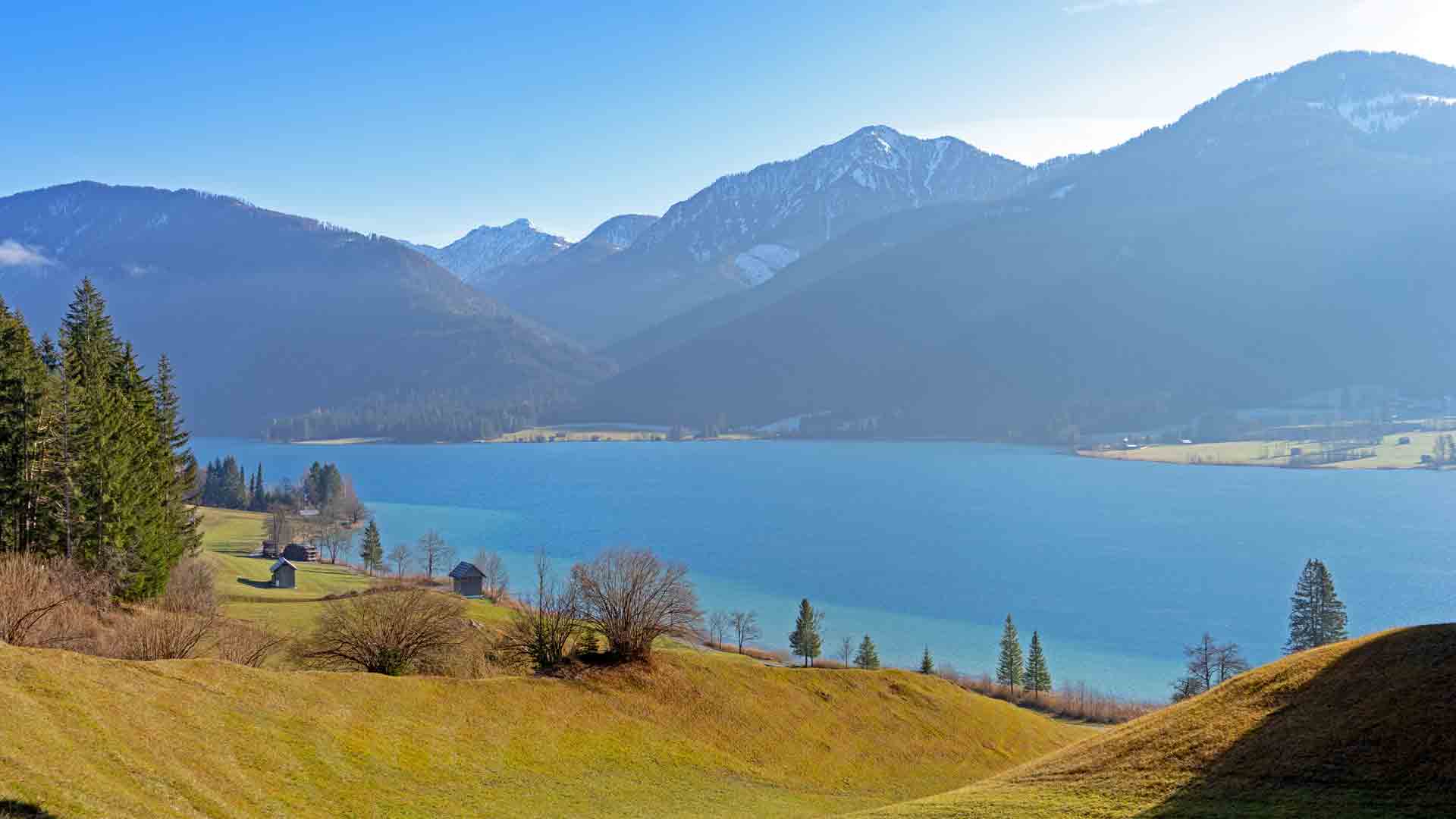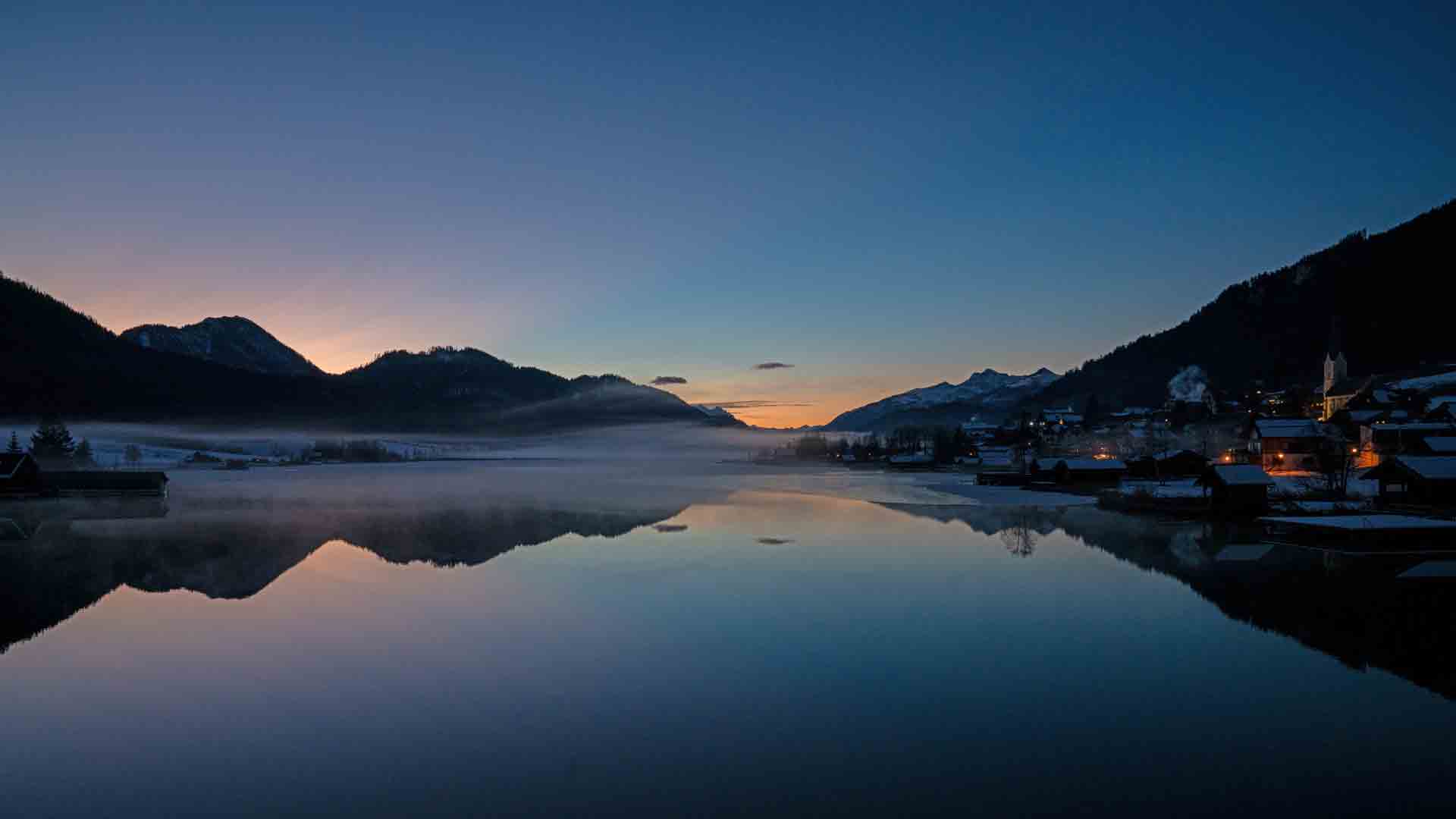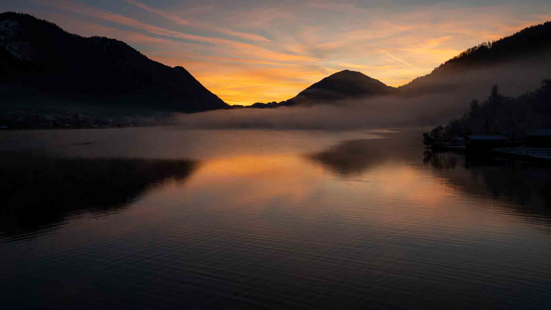 Wenn nach einer kalten Nacht am Morgen im Osten die Sonne aufgeht liegt oft eine Nebeldecke über dem See die sich aber schnell auflöst und damit den Blick über den ruhig da liegenden See freigibt.