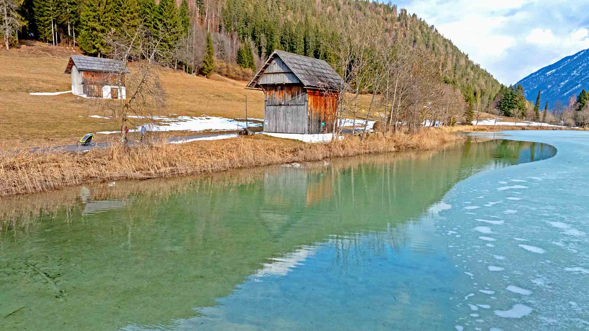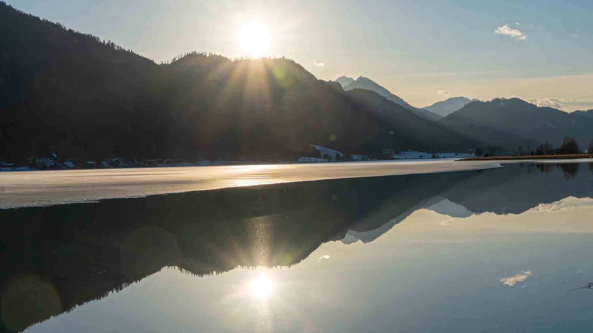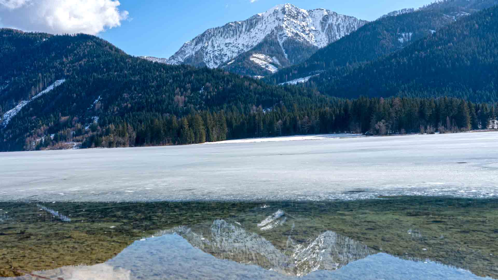 Das Eis zieht sich immer weiter vom Ufer zurück und gibt den Blick frei auf die Spiegelung des noch mit Schnee bedeckten Golzgipfels auf der Wasseroberfläche.