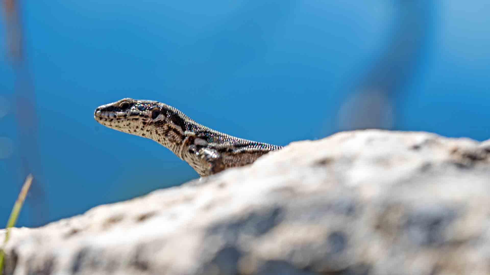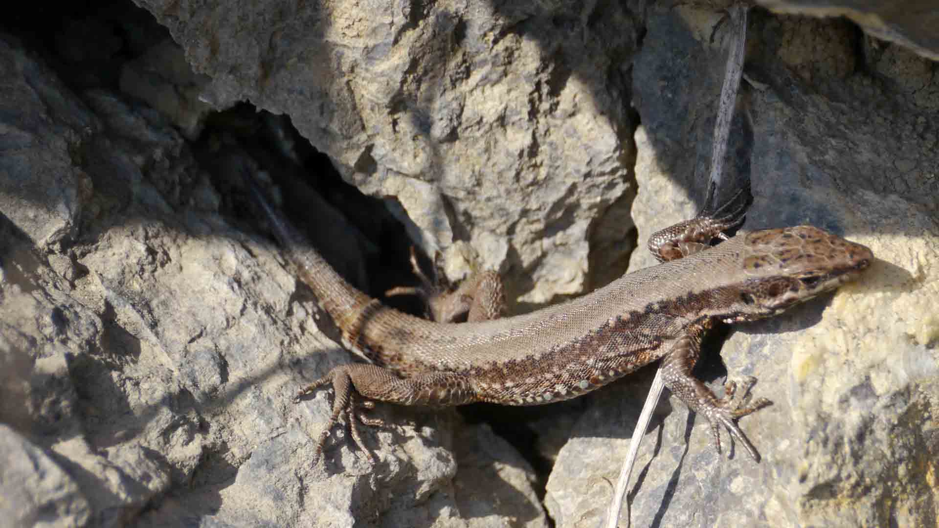 So sind in einer Felswand, gleich neben der Anlegestelle Steinwand, zahlreiche Eidechsen zu beobachten die ein erstes, wärmendes Sonnenbad genießen.
