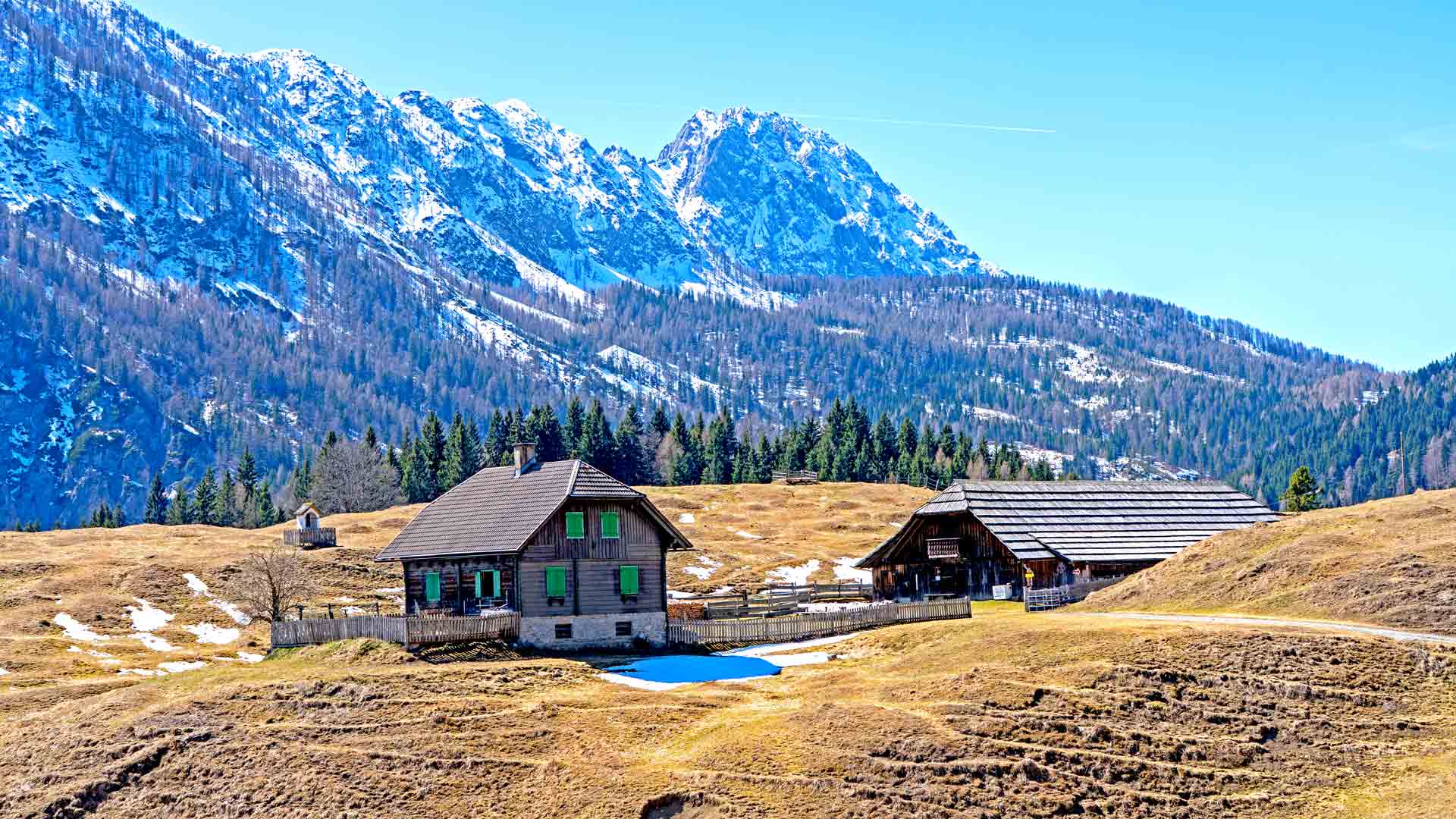 Die Alm liegt dort malerisch vor den steilen Wänden des Reißkofel auf dessen Gipfel noch tiefster Winter zu herrschen scheint.